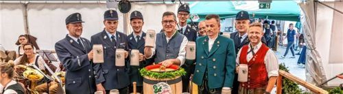 Auftakt nach Maß gestern bei der Feuerwehr Grainbach zum 150-jährigen Bestehen mit der Festmusikkapelle Samerberg. Höhepunkt der Festlichkeiten ist am morgigen Sonntag der Festgottesdienst um 10 Uhr mit Weihe der neuen Fahne. Unser Bild zeigt (von links) Albert Auer, Vorstand der Feuerwehr Grainbach