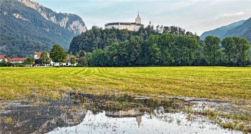 Nach dem Starkregen der vergangenen Tage gab es ein malerisches Spiegelbild in der Wasserpfütze in der Wiese unterhalb von Schloss Hohenaschau. Wer sich oben umsehen möchte, kann das bei verschiedenen Veranstaltungen im Schloss Hohenaschau tun. Die Führungszeiten sind Dienstag und Donnerstag 13.30 u