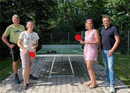 Der Förderverein der Aschauer Kinder, auf dem Foto vertreten durch die Vorsitzende Monika Arnold (Zweite von rechts) und Burgi Dingler-Gabriel (Zweite von links) hat für das Naturbad eine neue Tischtennisplatte samt Schlägern gespendet. Ein Dank geht an Rudi Angermaier (links) und sein Team vom Bauh