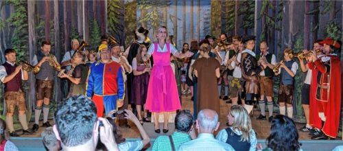 Der Bühnenauftritt von Schauspielern und Musikanten nach dem zweiten Akt ist bei den Ritterschauspielen Kiefersfelden gute Tradition jeder Aufführung. Das Bild mit der dirigierenden Daniela Ludwig beklatschten bei der Premiere zahlreiche Ehrengäste. Neben der Rosenheimer Bundestagsabgeordneten waren