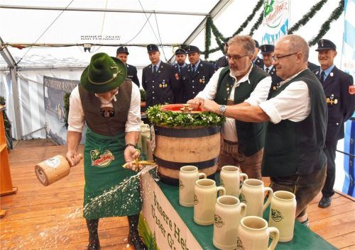 Schnell, pünktlich, Spritzer waren auch dabei, wie die Feuerwehr war gestern Abend Raublings Erster Bürgermeister Olaf Kalsperger beim Anstich zum 150-jährigen Feuerwehrjubiläum der Raublinger Wehr. Mit der Führungsspitze um die Vorsitzenden Paul Vodermaier und Thomas Wimmer sowie den Kommandanten M