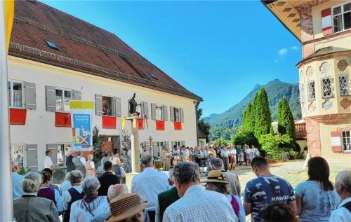 Bei Kaiserwetter und dennoch mit genügend Schatten feierte der Pfarrverband Oberes Priental zusammen mit Gästen bei einem festlichen Familiengottesdienst auf dem Kirchplatz in Aschau im Chiemgau das Bistumsjubiläum 1300 Jahre Heiliger Korbinian. Rings um die Korbinianssäule, die den Heiligen mit dem