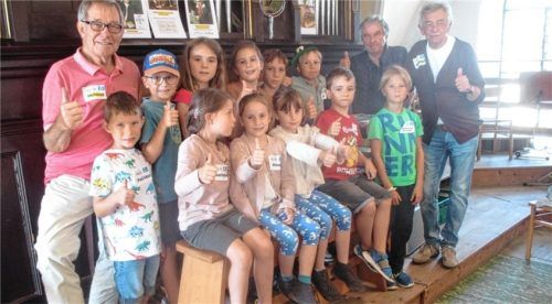 Erwartungsfroh scharte sich ein Dutzend Kinder um die Betreuer des Männergesangvereins Schloßberg. MGV-Vorsitzender Manfred Panhans (rechts) berichtete von der über 500 Jahre alten Kirche St. Stephanus. Mit Kirchenverwalter Franz Huber erreichten die jungen Gäste die Glockenstube mit ihren vier Gloc
