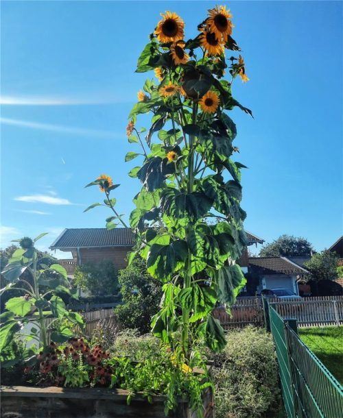 Hoch hinaus möchte diese Sonnenblume im Hochbeet. Gemessen wurde sie mit einer Höhe von 3,20 Metern. Fotografiert hat sie Leser-Reporterin Hildegard Hamberger in ihrem Garten in Rohrdorf. Wer sich angesichts dieser Dimensionen die Frage stellt, wie groß Sonnenblumen denn werden können, dem gibt das