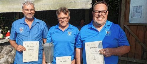 Als Höhepunkt der Saison führte der Hufeisenclub Vogtareuth Mitte August seine Dorfmeisterschaft durch. Bei herrlichem Wetter fanden sich hierzu 19 Teilnehmer am Bolzplatz ein. Als Dorfmeister im Einzelwerfen ging dabei Vorjahressieger Günther Ott (Mitte) mit einer Gesamtwurfweite von 80 Zentimetern