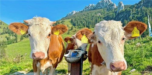 Benzinpreise sind immer wieder ein zentrales Thema. Doch im Vergleich zu den Zapfsäulen im Tal ist diese Tankstelle im Almengebiet für die vierbeinigen „Kunden“ unterhalb des massiven Kalkgesteins eine reine Genussstation. Ausdrucksstarke Schönheiten sind dabei diese Kälber, die ihr Dasein auf dem A