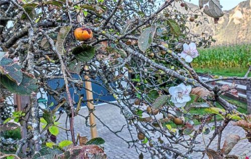 Leser-Reporter Georg Kalke aus Oberaudorf entdeckte kürzlich an seinem Apfelbaum, dass neben den reifen Früchten auch Blüten am Ast sind. Diese kuriose Situation hat er in einem Foto sehr gut eingefangen.