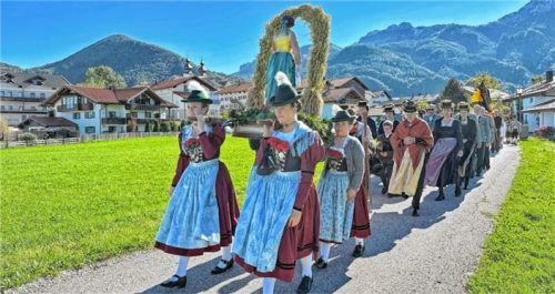 Aschau im Chiemgau – Die Aschauer Flurprozession an Erntedank ist eine der Besonderheiten des Kirchenjahres und Brauchtum. Angeführt von den Aschauer Fahnenabordnungen und Vereinen, trug Ortspfarrer Paul Janßen unter dem Traghimmel das Allerheiligste durch die Fluren von Aschau im Chiemgau. Die Dirn