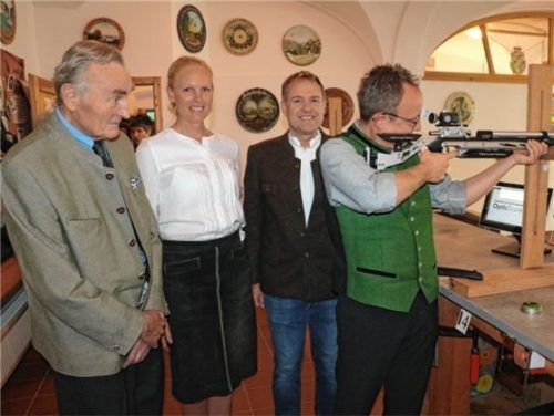 Bürgermeister Daniel Mair (rechts) machte – assistiert vom Schützenmeister der Schützengesellschaft Elfer Wildenwart Andreas Freund (Zweiter von rechts) – den ersten Schuss und eröffnete damit das vierte Wildenwarter Dorfkönigsschießen. Herzog Max in Bayern (links) und Herzogin Elizabeth in Bayern n