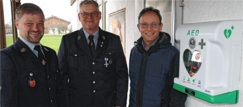 Einen Defibrillator beschaffte die Feuerwehr Umrathshausen gemeinsam mit der Gemeinde Frasdorf. Das Gerät hängt für jedermann gut zugänglich am Feuerwehrhaus und kann von jedem für lebensrettende Sofortmaßnahmen verwendet werden. Bürgermeister Daniel Mair (rechts), der Vorsitzende der Feuerwehr Umra