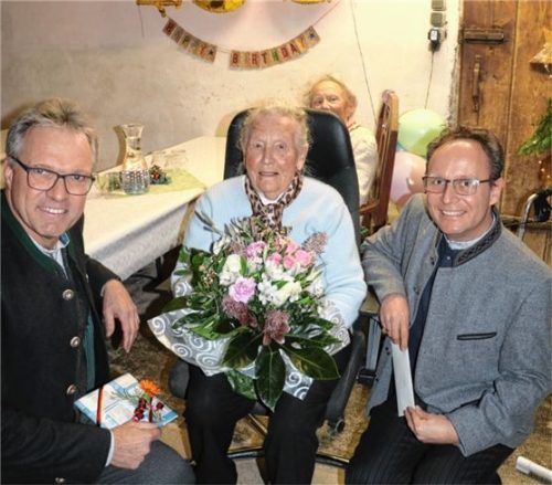 Anna Hamberger, die Nanni vom Niggl in Pfannstiel, feierte ihren 100. Geburtstag im Kreis der großen Familie, der Nachbarn, Freunde und der Vertreter der Ortsvereine im ausgeräumten ehemaligen Stall. Rund 100 Gäste kamen. Bürgermeister Daniel Mair (rechts) überbrachte die Glückwünsche der Gemeinde: