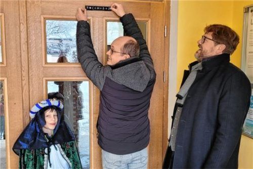 Eggstätt feiert 2025 sein 1100-Jähriges. Pfarrer Andreas Przybylski (Mitte) hatte dazu eine Idee: Auf den Klebebögen der Sternsinger ist neben der 925 – dem Jahr der ersten urkundlichen Erwähnung – auch ein Hinweis „1100 Jahre Eggstätt“ zu lesen. Bürgermeister Christoph Kraus (rechts) freute sich, d