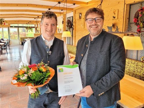 Erneut erhält der Landgasthof Zum Sägwirt in Eggstätt die Teilnahmeurkunde des Umwelt- und Klimapakts Bayern. Bürgermeister Christoph Kraus (rechts) überreichte Gastwirt Christian Stockmeier die Auszeichnung, mit der das Engagement des Betriebs für nachhaltigen Umweltschutz gewürdigt wird. Geprüft w