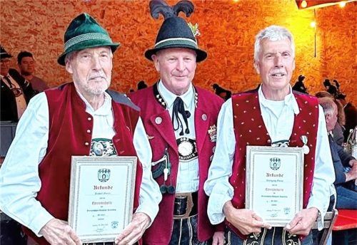 Die Zwillingsbrüder Wolfgang (rechts) und Rudolf Gsinn (links) feierten beide kürzlich ihren 70. Geburtstag. Beide sind seit Jahrzehnten aktive Mitglieder der Gebirgsschützenkompanie (GSK) Samerberg. Zu diesem Anlass gratulierte die Kompanie ihren Geburtstagskindern mit einem dreifachen Ehrensalut.