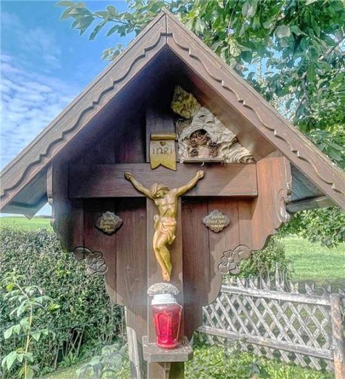 Unweit und in guter Sicht zur Kirche „Christkönig“ in Wildenwart gibt es im Garten der Prutdorfer Familie Johanna und Helmut Rosenwink ein Feldkreuz, das es wahrlich in sich hat. Unter dem geschützten Dach haben sich Hornissen mit einem sehenswerten Nest niedergelassen. Feldkreuz und Hornissen-Bauwe