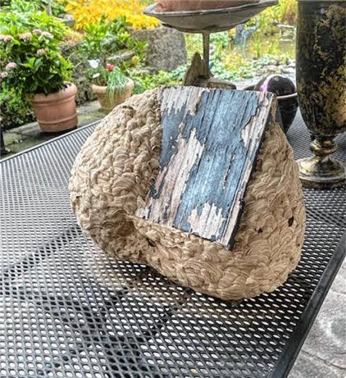 Ein wahres Kunstwerk haben Erdwespen rund um ein Vogelhäuschen gebaut, das Leser-Reporterin Gitta Holzner aus Nußdorf auf ihrem Terrassentisch hinter dem Haus dekoriert hat. Aus dem einfachen Holzhäuschen wurde ein regelrechter Palast – wohl durchdacht – mit zwei Ein- und Ausgängen. Durch die exponi