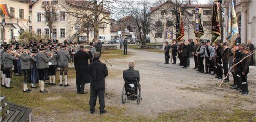 Wie in jedem Jahr versammelten sich in Kiefersfelden die Fahnenabordnungen der Traditionsvereine, die Musikkapelle, die Vorsitzenden des VdK und der Veteranen sowie der Bürgermeister zum Gedenken an die Gefallenen der Weltkriege vor dem Denkmal und legten gemeinsam drei Kränze nieder. Nur wenige Bür