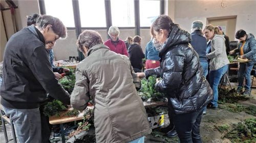 Fleißig gebunden hatten wieder viele Frauen der Pfarrgemeinde Prutting am Donnerstag vor dem ersten Advent in der Thusbaßhalle. Durch die großzügigen Spenden von Daxen und allerlei grünen Zweigen konnten über 80 Adventskränze und Türkränze gefertigt werden. Verkauft wurde am darauffolgenden Samstag