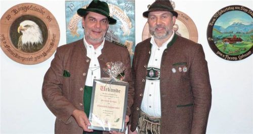 Die Thomasschützen Frasdorf haben einen neuen Ehrenschützenmeister. Gauschützenmeister Bernhard Brehmer (links) wurde bei der Jahresversammlung für seine langjährigen Verdienste zum Ehrenschützenmeister ernannt. Schützenmeister Christian Schlosser (rechts) ließ in seiner Laudatio das Wirken von Bern