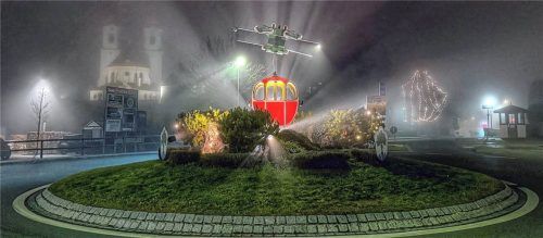 Dichter Nebel legt sich über Aschau, doch die rote Gondel im Kreisverkehr strahlt wie ein mystischer Blickfang in der Nacht. Sie verwandelt den markanten Platz des Dorfes am Fuße der Kampenwand in ein stilles, fast märchenhaftes Leuchten. Im Hintergrund, sanft verschleiert, ragen die Türme der katho