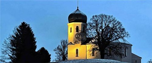 Die 1934 von Kardinal Faulhaber eingeweihte und auf einem Hügel stehende Kirche Christkönig in Wildenwart zeigt sich gerade bei einbrechender Dämmerung in einem besonders schönen Licht. Das Bild entstand während der Weihnachtsferientage und zeigt die Pfarrkirche im Abendlicht. Foto Hötzelsperger