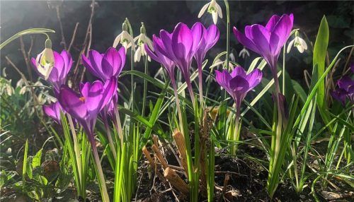 Sie sehen auch aus der Zwergen-Perspektive schön aus – Krokusse und Schneeglöckchen im Frühlingslicht – Boten für das Ende des Winters, gesehen in einem Garten in Raubling.Foto Binder