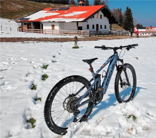 Noch liegt auf den Bergen der Region reichlich Schnee. Beim Bergradln ist besondere Vorsicht geboten, die Wege sind zum Teil noch mit Schnee und Eis bedeckt. Sicherer ist’s zu Fuß, bei Bedarf mit Grödeln. Fotografiert im Daffner-alm-Gebiet am Heuberg. Foto Niederbuchner