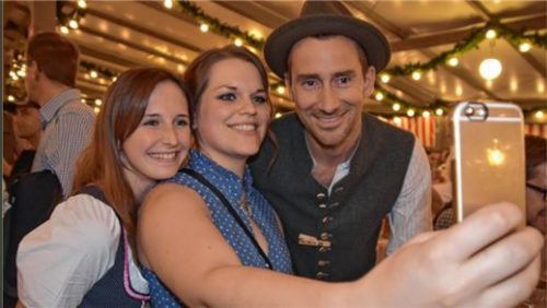 „Harry die Ehre“ heißt die neue Comedy-Serie von Markus Stoll (bürgerlicher Name) alias Harry G., der am Samstagabend in der Flötzinger-Brauereibox die Aufmerksamkeit auf sich zog. Dort ein Plausch, da ein Selfie, hier mit den Fans Sabrina (links) und Sarah – und schon hatte der aus Film und Fernseh
