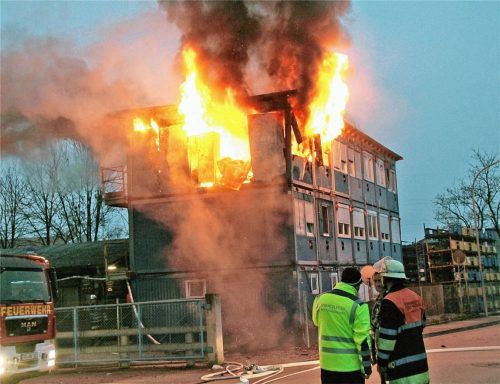 Lichterloh in Flammen stand am Samstagmorgen ein Wohncontainer in einem Rosenheimer Gewerbegebiet. Die Feuerwehr brachte das Feuer schnell unter Kontrolle. Personen wurden laut Polizei nicht verletzt. Beim Eintreffen der Rettungskräfte gegen 7 Uhr standen Teile des zweiten Stockwerks der Bau- und Wo