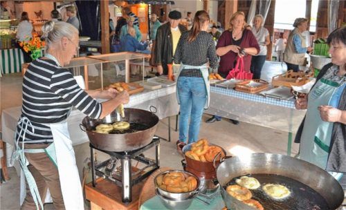 Wie jedes Jahr buken fleißige Damen des Simsseemarktes Stephanskirchen auf dem Baierbacher Bauernmarkt über 600 Kirtanudeln heraus. Auch den Teig machten die Frauen selbst. Die Kirtanudeln wurden auf dem Bauernmarkt verkauft. Viele Käufer ließen sich das schmackhafte Schmalzgebäck mit einer Tasse Ka