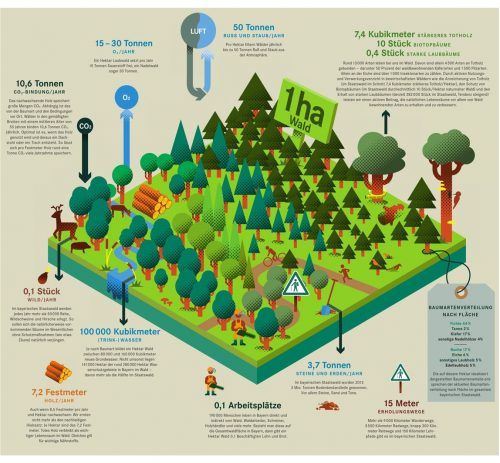Lebensraum, Erholungsgebiet, Rohstofflieferant, Arbeitgeber, Luftreiniger, Wasserproduzent – der Wald, das zeigt diese Grafik der Bayerischen Staatsforsten, ist ein wahres Multitalent.