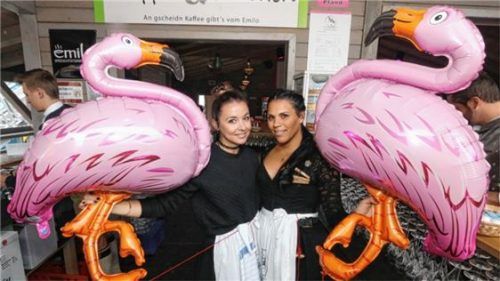 Rosaroter Wiesn-Hit: Flamingos sind wegen des aktuellen Sommerhits von „Ingo ohne Flamingo“ nicht nur am „Ballermann“ auf „Malle“ in Mode, sondern auch in Ballonform auf der Wiesn. Der Wiesnigel Ignaz würde allerdings für die feschen Madln in der Bildmitte alles fliegen und stehen lassen – Flamingos