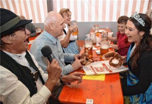 Das Brezenhakeln sei ein traditioneller „Bierzeltsport“, erklärte Franz Knarr (links) den schaulustigen Zeltbesuchern, als sich Fritz Gerlmeier, Pressereferent vom Bayerischen Blinden- und Sehbehinderten-Verband, Kreisverband Rosenheim, und die Miss Herbstfest dieses Duell am Biertisch im Flötzinger