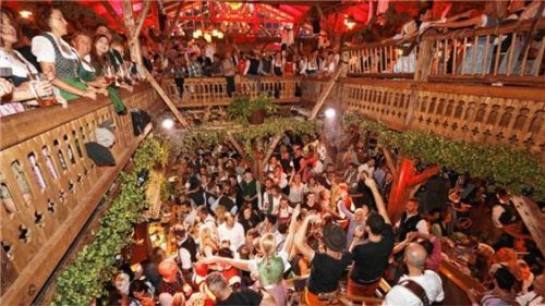 Volle Hütte: Nicht nur in den beiden Bierburgen, sondern auch in den „Wellness-Oasen“ Tatzlwurm (links) und Proseccostadl (rechts) geht es jeden Abend hoch her – kostenlose Ganzkörpermassage inklusive. Fotos stuffer