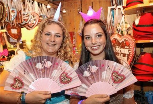 Souvenirs, Souvenirs: Besonders „in“ sind im Auerbräu der neu designte Flamingo-Fächer von Evi Gröning ebenso wie die LED-Krone oder auch das LED-Einhorn: Die Souvenir-Mädchen Sabrina Gegenfurtner aus Kolbermoor (links) und Nicole Gröning aus Happing präsentierten die drei beliebten Gegenstände im A