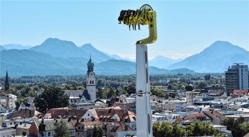 Die Wiesn mit Bergblick: Wer auf dem Rosenheimer Herbstfest eine gemütliche Runde mit dem Riesenrad dreht, der ist nicht nur mit dem erhobenen Arm des „V-Maxx“ auf Augenhöhe, sondern genießt auch eine traumhafte Aussicht über die Dächer der Stadt und die St.-Nikolaus-Kirche hinweg ins bayerische Inn
