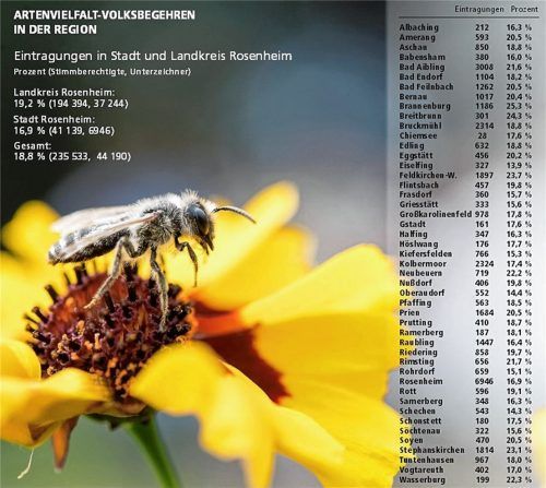 Rosenheim/Traunstein – Das konnte man in dieser Klarheit in der Region nicht erwarten: Fast jeder fünfte Wahlberechtigte hat das Volksbegehren Artenvielfalt „Rettet die Bienen“ unterzeichnet: 19,2 Prozent waren es im Landkreis Rosenheim, 17,7 im Kreis Traunstein und 16,8 im Kreis Mühldorf.