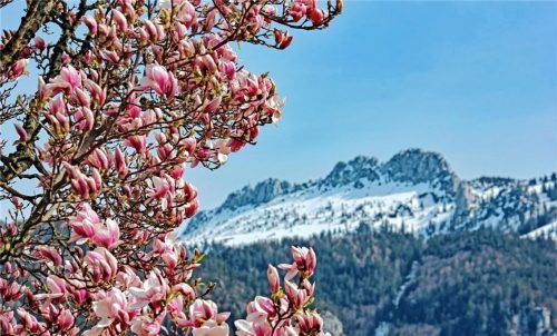 Ein blühender Magnolien-Baum im Vordergrund, noch reichlich Schnee auf der Kampenwand: So präsentiert sich derzeit das Bankerldorf Aschau im Chiemgau. Ein besonderes Naturschauspiel in einer besonderen Zeit, die gleichermaßen Augen und Nase verwöhnt. Ja, es ist Frühling.Foto Reiter