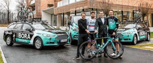 Der Raublinger Radrennstall BORA-hansgrohe um Peter Sagan (Zweiter von links) und den Wahl-Samerberger Marcus Burghardt (rechts) – hier mit Teammanager Ralph Denk (links) und Willi Bonke, Geschäftsführer von Auto Eder – startet am heutigen Samstag in seine sechste Tour de France – zusammen mit Auto