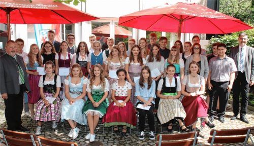 41 Schüler der Mittelschulen im Landkreis Rosenheim haben ihren Abschluss mit der Note 1,5 und besser geschafft. Der stellvertretende Landrat Josef Huber (links) ehrte sie zusammen mit Markus Kinzelmann (rechts) vom Staatlichen Schulamt im Garten des Landratsamtes Rosenheim. Huber sprach von einer b