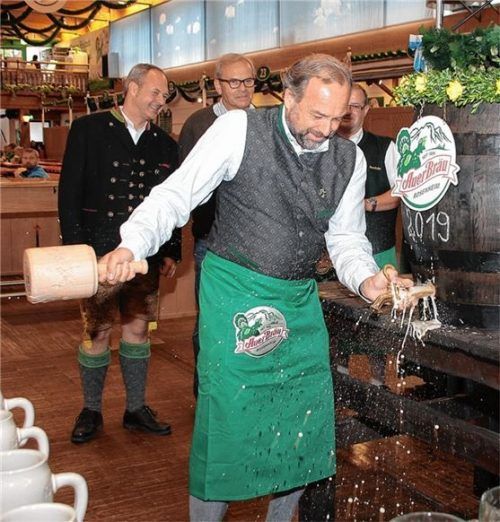 Absolut drepfalfrei, wie dieses Bild beweist (alles andere sind Fake-News), zapft hier OVB-Verleger Oliver Döser eines der besonderen Retro-Holzfassl in der Auerbräu-Festhalle an. Drei Hiebe mit rechts, dazu ein Sicherheitsschlag und ein Lächeln – das war Dösers Zapfbilanz vor den Augen von Festwirt