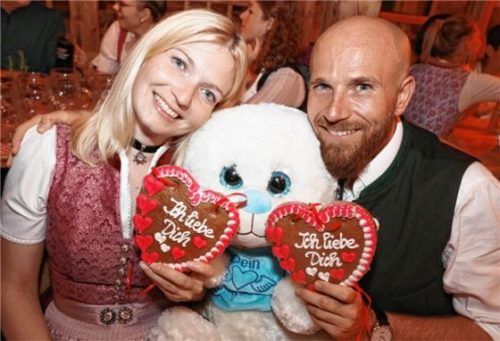 Mit dem oder der Liebsten auf die Wiesn gehen – was gibt es Schöneres? Dann ein Stofftier an den Buden gewinnen, ein Lebkuchenherz als Liebesbeweis für seinen Partner holen – dazu gutes Essen und süffiges Bier: Das Rosenheimer Herbstfest verlieh nicht nur diesem feschen Paar ein strahlendes Lächeln.