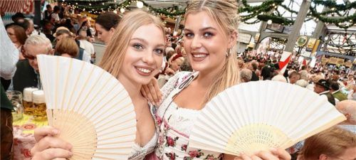 Wenn es heiß ist in der Bierburg, sind Fächer ein gutes Mittel. Nicht nur Laura (rechts) aus Rosenheim und Kim aus Prutting haben mit ihren handbetriebenen Mini-Klimaanlagen schon viel Wind gemacht auf der Wiesn. Ob sich die jungen Casanovas da immer anständig an die Abstandsregel gehalten haben? Fo
