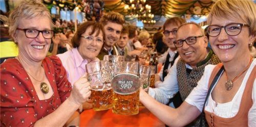 „Mia san mia“ hoaßt´s beim FC Bayern – „mia san SPD“ bei den Rosenheimer Sozialdemokraten. Für den Besuch in der Auerbräu-Festhalle hat sich die Stadt-SPD ein Lederhosenschild mit dieser Aufschrift anfertigen lassen und auf einem Krug befestigt. Das Schild hielt einem kräftigen Prost unter (vorne vo