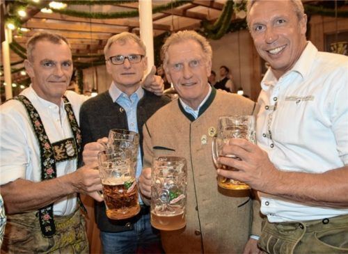 Wenn das kein Legendentreffen ist: Vier Rosenheimer Eishockeygrößen stoßen hier in der Auerbräu-Festhalle darauf an, dass die derzeit drittklassigen Starbulls bald wieder größere Sprünge machen: Raimund Hilger (53), Ernst Höfner (61), Hans Zach (70) und Markus Berwanger (56) haben in Rosenheim die g