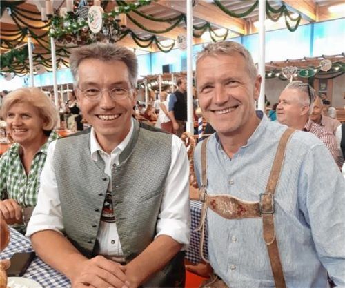 Beim Bürgermeistertreffen in der Auerbräu-Festhalle ließen sie die Wahlkampf-Boxhandschuhe zu Hause und tauschten sie gegen eine frische Mass Bier ein: Otto Lederer (CSU, links) und Rainer Auer (SPD). So eine Mass schmeckt auch wesentlich besser als eine Leder(er)-Faust, scherzte der Igel. Lederer u