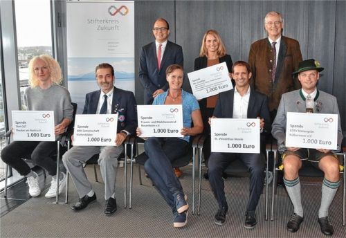 Alfons Maierthaler, Vorstandsvorsitzender des Stifterkreises Zukunft (hinten rechts), Markus Götz, Vorstandsmitglied des Stifterkreises (hinten links) und Alexa Hubert, dessen Geschäftsführerin (hinten Mitte) überreichten jetzt jeweils 1000 Euro an die Vorsitzenden von fünf gemeinnützigen Organisati