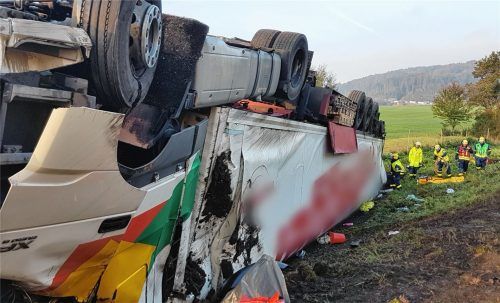 Lkw kommt von der Autobahn ab und überschlägt sich