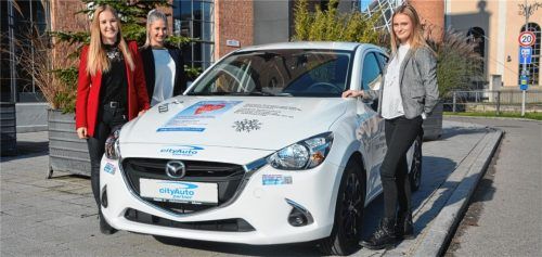 An einem sonnigen Herbsttag durften Tina, Nina und Andrea (von links), Azubis von City-Autopartner Kolbermoor, schon mal eine kleine Spritztour mit diesem sportlichen Kleinwagen machen. Hierbei handelt es sich um einen Mazda 2 im Wert von 16000 Euro, der im Rahmen der Weihnachtsaktion „OVB-Leser zei