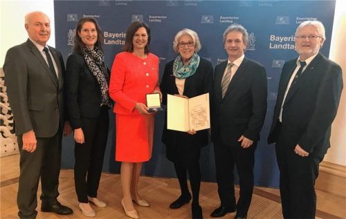 Große Freude bei Monika Reiter aus Bernau und Rupert Voß aus Brannenburg: Die beiden Landkreisbürger haben jetzt die Bayerische Verfassungsmedaille verliehen bekommen. Reiter (links, Dritte von rechts), die ein Modeatelier in Bernau betreibt, bekam von Landtagspräsidentin Ilse Aigner (Dritte von lin
